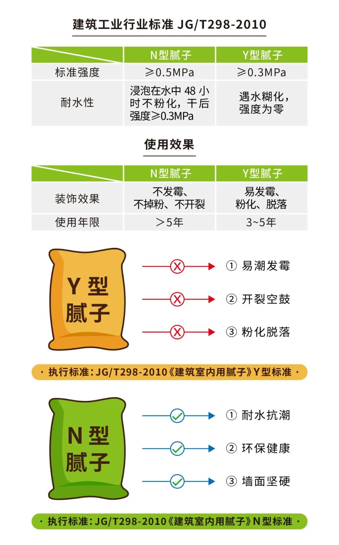 //提示:使用便宜腻子会付出大代价 业主在装修时会遇到预算问题, 选择建材讲究性价比, 有的腻子30几元一包,有的腻子20几元一包, 同样都说防水防霉,那为什么要多花钱呢? 腻子预算少一点,就可以买更好的面漆! 但业主们并不知道: 有的“防水防霉”不是真的防水防霉。 “福州属南方潮湿的气候,当然要用‘N’型,油漆工买来的却是‘Y’型。两种差价10多元,而且油漆工买的还不是大品牌。”黄先生看到已经不再平滑的白墙,无奈抱怨装修建材市场“水太深”。————海峡都市报报道 为了省钱,用了10几20元的Y型腻子, 刚入住没多久,墙面就开始起皮脱落, 还得重新找临时住处, 花了更多的钱重新做墙面。 //提示:N型耐水腻子才是真耐水腻子 有朋友问阿匠叔, 30几元的腻子真的就比20几元的腻子好吗? 其实重点不是价格, 而是在于腻子的执行标准。 N型耐水腻子从原材料到制作工艺上 都比Y型腻子复杂, 所以在市场上的定价高于Y型腻子, N型耐水才是真耐水,Y型腻子不耐水。 业主们在购买腻子时,不要觉得说: 买贵就对了,要认准腻子粉的执行标准。 (腻子粉包装背后,都会有腻子执行标准) //提示:到底哪里才有好的耐水腻子 就像海都报道说的一样, 市面上许多厂家 在面对N型还是Y型的提问时不敢回答, 很大一个原因是: 市面上真的N型耐水腻子少之又少 业主认定大品牌, 觉得可以买到放心的腻子产品, 但市面上很多知名品牌的腻子产品, 写着“防水防霉”,却是Y型腻子。 我们365bet体育在线注册_365 体育投注_123656的网站怎么开www
